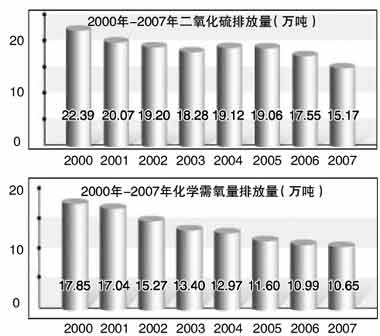 在這次考核中,2007年北京市二氧化硫排放量比2006年下降了13.8%,下降速度居全國之首,而化學需氧量下降的速度也在全國名列前茅。
