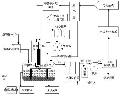 等離子體廢物處理系統(tǒng)主要由進(jìn)料系統(tǒng)、等離子體主反應(yīng)腔、金屬/玻璃體收集系統(tǒng)、熱能回收利用系統(tǒng)、尾氣凈化處理系統(tǒng)、二次燃燒室、自動控制系統(tǒng)等構(gòu)成。