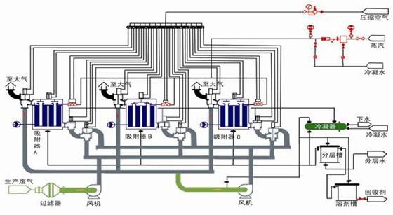 該流程采用三個(gè)吸附器循環(huán)切換運(yùn)行(見(jiàn)圖),當(dāng)吸附器A處于吸附狀態(tài)時(shí),吸附器B處于蒸汽脫附狀態(tài),吸附器C處于冷卻、干燥狀態(tài);切換時(shí)間一到,有關(guān)閥門自動(dòng)切換,吸附器A、B、C的運(yùn)行狀態(tài)依次轉(zhuǎn)換,循環(huán)運(yùn)行。三吸附器流程的有機(jī)尾氣凈化回收率可在兩箱基礎(chǔ)上得到很大提高。