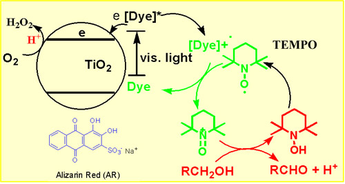 ![]() Dye/TiO2/TEMPO可見光光催化醇類選擇性氧化機理 |