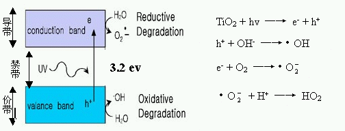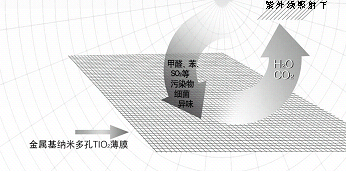 納米光催化劑是污染物的克星,其作用機(jī)理簡(jiǎn)單來說(如下圖所示)就是:納米光催化劑在特定波長(zhǎng)的光的照射下受激生成"電子一空穴"對(duì)(一種高能粒子),這種"電子一空穴"對(duì)和周圍的水、氧氣發(fā)生作用后,就具有了極強(qiáng)的氧化-還原能力,能將空氣中甲醛、苯等污染物直接分解成無害無味的物質(zhì),以及破壞細(xì)菌的細(xì)胞壁,殺滅細(xì)菌并分解其絲網(wǎng)菌體,從而達(dá)到了消除空氣污染的目的。
