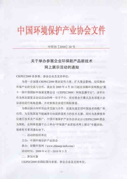 為推動(dòng)國(guó)內(nèi)外環(huán)保技術(shù)交流與合作,促進(jìn)先進(jìn)實(shí)用環(huán)保技術(shù)的推廣和應(yīng)用,為實(shí)現(xiàn)國(guó)家節(jié)能減排目標(biāo)提供強(qiáng)有力的技術(shù)支撐,同時(shí)為各參展單位進(jìn)行技術(shù)及產(chǎn)品推廣,中國(guó)環(huán)境保護(hù)產(chǎn)業(yè)協(xié)會(huì)決定以CIEPEC2009展會(huì)為契機(jī),在網(wǎng)絡(luò)直播平臺(tái)上舉辦“環(huán)保新產(chǎn)品新技術(shù)網(wǎng)上展示”專題活動(dòng)。現(xiàn)將有關(guān)事項(xiàng)通知如下: