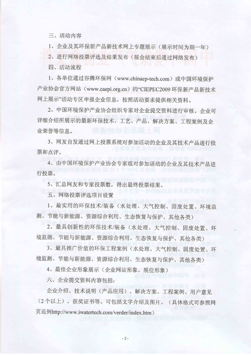 4、由中國(guó)環(huán)境保護(hù)產(chǎn)業(yè)協(xié)會(huì)專家組對(duì)參加活動(dòng)的企業(yè)及其技術(shù)產(chǎn)品進(jìn)行投票。