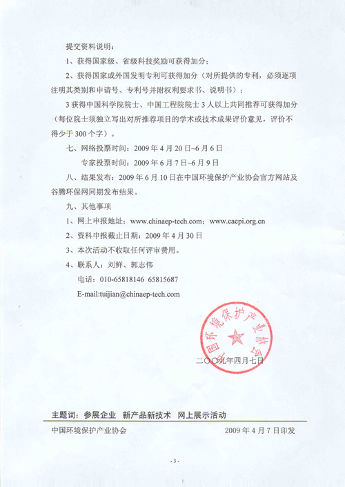 八、結(jié)果發(fā)布:2009年6月10日在中國(guó)環(huán)境保護(hù)產(chǎn)業(yè)協(xié)會(huì)官方網(wǎng)站及谷騰環(huán)保網(wǎng)同期發(fā)布結(jié)果。