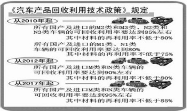 由于我國每年新車產(chǎn)量達(dá)到了舉世矚目的千萬輛規(guī)模,已居世界前列;而且每年舊車報(bào)廢量也達(dá)到了相當(dāng)規(guī)模。除了對(duì)汽車的節(jié)能、減排和安全不斷提出越來越嚴(yán)格的技術(shù)法規(guī)要求外,國家還從加快循環(huán)經(jīng)濟(jì)和建設(shè)節(jié)約型社會(huì)的政策高度對(duì)汽車的綜合環(huán)保效應(yīng)和資源可循環(huán)利用提出了新要求。