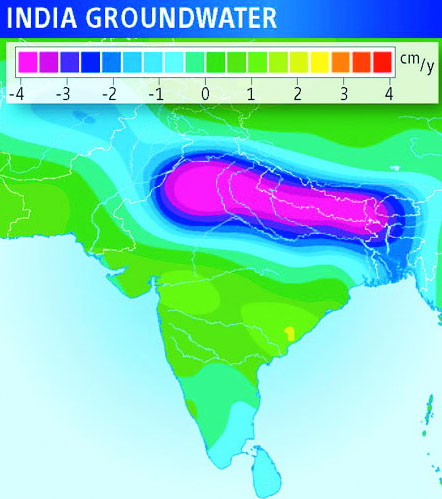 除了冰原的損耗之外,全世界最大的引力下降來自于GRACE最初于6年前發(fā)現(xiàn)的、一塊以新德里為中心的東西走向面積達(dá)270萬平方公里的狹長區(qū)域。印度海得拉巴市國家地球物理學(xué)研究所的地球物理學(xué)家Virendra Tiwari,美國博爾德市科羅拉多大學(xué)的John Wahr以及博爾德市國立大氣研究中心的Sean Swenson報(bào)告說,通過調(diào)整因降水和蒸發(fā)導(dǎo)致的自然變化,GRACE所測定的引力下降大致相當(dāng)于地下水每年損耗54立方千米±9立方千米。這意味著整個(gè)地區(qū)每年的地下水位平均下降約10厘米。研究人員在《地球物理學(xué)研究快報(bào)》上報(bào)告了這一研究成果。