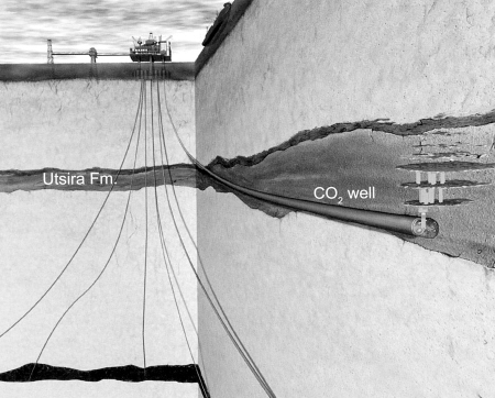 1996年,挪威政府將斯萊普尼肯爾氣田地區(qū)作為存碳區(qū),他們?cè)诰嚯x斯萊普尼肯爾A平臺(tái)幾百米遠(yuǎn)處建立了一個(gè)收集工廠,這個(gè)足球場(chǎng)大小的設(shè)備由 4根混凝土圓柱支撐,放置在常有風(fēng)浪的北海海平面30米之上。二氧化碳通過高壓管道被注入海床1公里下的沙石層之中,又被一個(gè)長700公里,寬70公里至 80公里,含多孔砂巖層的Utsira鹽湖所吸收。其上方覆蓋著數(shù)百米不透氣的細(xì)泥巖,二氧化碳在巖層中形成化合物晶體后便能自然沉降。至今過去13年,相關(guān)技術(shù)專家稱,已證明了此項(xiàng)技術(shù)的安全性。
