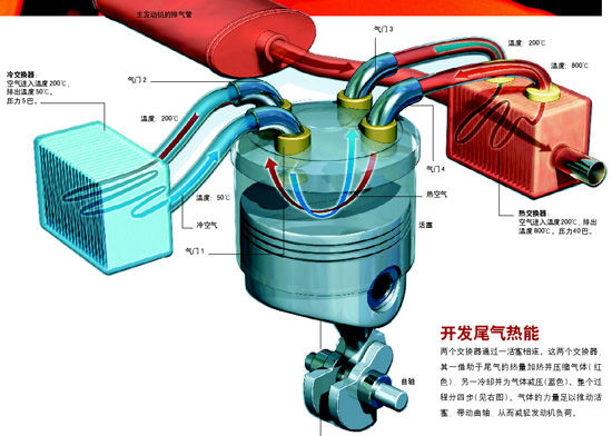 一般人可能不知道,傳統(tǒng)汽車至多只能把燃料所蘊(yùn)含的30%的能量轉(zhuǎn)換為牽引力(日常轉(zhuǎn)換率甚至低至10%~20%),其余三分之二都變?yōu)闊崮芟。其中一小部?5%)通過(guò)輻射,一部分(30%)進(jìn)入冷卻回路,而更多(35%)則是通過(guò)尾氣排出。換言之,以氮、水蒸氣和二氧化碳為主要成分的汽車尾氣,蘊(yùn)藏著燃料中三分之一以上的能量!這就有文章可做了,只要對(duì)其加以充分利用,便能有效節(jié)約能源。這樣不僅節(jié)省了開支,也將造福于地球。因?yàn)楹哪芘c二氧化碳排放息息相關(guān),減少1%的能源消耗等于減少1%的二氧化碳排放!