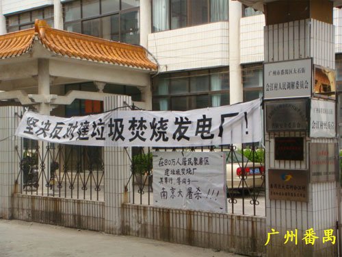 北京阿蘇衛(wèi)的民眾,警察來維持秩序,他們也不害怕,都換了服裝(圖片);這是高安屯,把警車圍住(圖片);上海的萬人簽名(圖片);南京,這個標語貼在橫幅“人民當家作主”上,貼得很好(圖片),南京天井洼在搏斗(圖片);這是著名的南京514流血事件(圖片),是我們國家第一起因為反垃圾焚燒而起的武斗事件;這個是廣州的番禺,當?shù)氐拿癖娫诤灻?圖片);這是南京的,民眾代表拿著一面錦旗送到建設部,為什么這么做?是因為建設部派了官員到那個地方做了一次調(diào)查,聽了民眾的聲音,他們非常感動,就拿了一面錦旗來送的一個場面。這是蘇州平望(圖片);這也是番禺的圖片:“在八十萬人居住的小區(qū),建設垃圾焚燒場,就等于是南京大屠殺!”(圖片)。