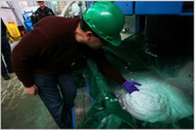 在美國加利福尼亞州的蒙特利灣(Monterey Bay)附近,電力供應(yīng)商Dynegy公司的一座大型天然氣發(fā)電廠噴射出含有大量二氧化碳煙氣。然而,這些廢氣將經(jīng)由管道從發(fā)電廠輸送到Calera公司的示范性水泥廠里。煙氣首先被抽入一座巨大的藍(lán)色容器中,接著噴灑上從附近海里抽取的海水,然后產(chǎn)生乳白色液體。液體隨后被泵入巨大的過濾器中,進(jìn)行固液分離,留下類似牙膏的白色物質(zhì)。最后在噴霧干燥器中,由煙氣余熱加熱的空氣將白色糊狀物轉(zhuǎn)化為水泥和集料顆粒。
