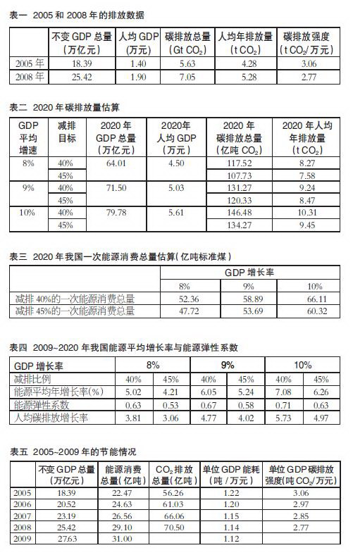 我國政府作出到2020年單位GDP的CO2排放量比2005年降低40%~45%的承諾。根據(jù)我們的理解,對這個承諾首先需要明確兩點:一是此排放特指化石能源利用和水泥生產(chǎn)的排放,不包括土地利用的排放,亦不包括生態(tài)建設(shè)的(固碳)負排放;二是GDP計量必須是2005年的不變價格,不能是名義GDP(即要排除通脹因素),并只能以人民幣為單位,不能以美元計(即要排除匯率變動因素)。在這樣的前提下,我們即可計算出2020年我國總共可以排放多少CO2。
