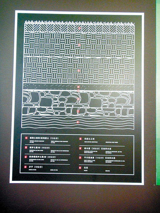 由于垃圾填埋場(chǎng)土層十分不穩(wěn),不能建造任何項(xiàng)目,因此,度身定制了垃圾多層覆蓋方案,著力在此創(chuàng)造肥沃土壤,種花種樹(shù)打造公園。有一張圖表很形象地展示了1.6米深的覆蓋方案(附圖):石塊和水泥組成的平日覆蓋層、排水層 、無(wú)紡?fù)凉げ、沙子層、防滲透保護(hù)土層、保護(hù)土層,還有最上面的植物堆肥土壤。由于它的不完全滲透性,既可把沼氣的散逸減至最低,也可促進(jìn)有機(jī)物質(zhì)的礦物化。如今,蒙特利爾市政府每年都會(huì)把收集到的落葉送到CESM做堆肥,肥料除了用于市政園藝活動(dòng),還免費(fèi)分發(fā)給市民。
