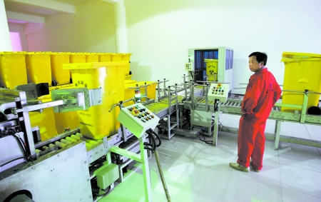 一進(jìn)入三層樓的工作區(qū),眼前的設(shè)施更出乎記者預(yù)料。一樓安置了一個(gè)循環(huán)傳送帶,左右各有一個(gè)藍(lán)色通道直達(dá)樓上。剛運(yùn)到中心的垃圾桶放上傳送帶后就自動(dòng)抵達(dá)藍(lán)色通道前。“這個(gè)系統(tǒng)投資了200多萬(wàn)元。”負(fù)責(zé)經(jīng)營(yíng)醫(yī)廢中心的瀚洋環(huán)保公司總經(jīng)理曹光介紹,為了提高醫(yī)廢中心現(xiàn)代化水平,減少工人直接與醫(yī)廢垃圾接觸的機(jī)會(huì),他們專門(mén)購(gòu)買了這套裝置,那個(gè)藍(lán)色通道類似電梯,左右一上一下,從一樓直通三樓傾倒區(qū)。