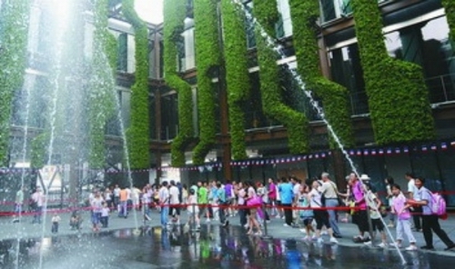 | 在法國(guó)館的中心廣場(chǎng),雨水順著法國(guó)館四周的收集管道匯聚到地面下的大水池,從樓頂?shù)鹊胤搅飨聛?lái)的雨水則從四周的水溝流入大水池。當(dāng)水池的水達(dá)到一定量時(shí),噴泉就會(huì)自動(dòng)啟動(dòng)! |