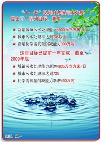 截至2009年底,全國(guó)城鎮(zhèn)污水處理能力新增4835萬立方米/日(規(guī)劃為4500萬立方米/日),城市污水處理率達(dá)到73%(規(guī)劃為≥70%),化學(xué)需氧量(COD)削減能力新增450萬噸(規(guī)劃為300萬噸)。全國(guó)城鎮(zhèn)累計(jì)建成污水處理廠1993座,總處理能力已超過1億立方米/日,與“十五”末相比分別增長(zhǎng)了1.2倍和75%。