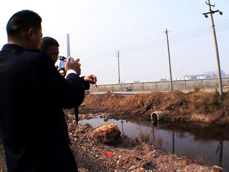 | 環(huán)保局執(zhí)法人員正在彭澤興達化工有限公司非法排污口取證,該排污口每天排出大量Ph值為1 的強酸性廢水 |