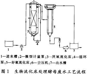 本試驗(yàn)采用厭氧-好氧-混凝的處理工藝。由于酵母廢水懸浮物較高,pH較低,在進(jìn)入生化處理系統(tǒng)前需要對(duì)原廢水進(jìn)行適當(dāng)?shù)念A(yù)處理.試驗(yàn)采用投加熟石灰調(diào)節(jié)pH,將酵母廢水的pH調(diào)到7.0~7.5,使進(jìn)入?yún)捬醴磻?yīng)器的廢水適合厭氧微生物的生長(zhǎng)環(huán)境,經(jīng)沉淀分離后的廢水用計(jì)量泵輸送至厭氧流化床,厭氧出水直接進(jìn)入好氧流化床,好氧出水再進(jìn)行混凝試驗(yàn)。生物處理系統(tǒng)由配水槽、微型計(jì)量泵、厭氧生物流化床、三重環(huán)流好氧三相生物流化床、空壓機(jī)和氣體流量計(jì)等設(shè)備組成,混凝試驗(yàn)采用穩(wěn)定運(yùn)行好氧出水的燒杯試驗(yàn)。酵母廢水生物流化床處理工藝流程見(jiàn)圖1。