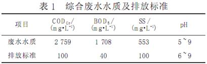 該廠廢水特性與生產密切相關,水量季節(jié)性差異十分明顯,各生產工序的排水量和有機物含量差別大,公司投產后日排廢水約3000t,主要包括前處理洗果水、設備清洗用水、地面沖洗水、外排循環(huán)水、生活污水等,其混合廢水水質及排放標準如表1所示。