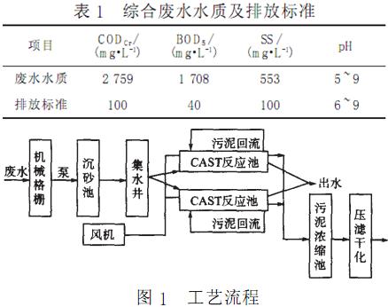 廢水經(jīng)機(jī)械格柵去除粗大懸浮物后排入沉砂池去除水中固體砂粒(D>0.22mm),出水流入集水井,當(dāng)集水井到高液位時(shí),將廢水泵入細(xì)篩機(jī)去除水中細(xì)小懸浮物,后流入CAST池,廢水經(jīng)CAST池處理后達(dá)標(biāo)排放。CAST池產(chǎn)生剩余污泥排入污泥池后打入壓濾機(jī)進(jìn)行壓濾處理,泥餅可作為農(nóng)田肥料。