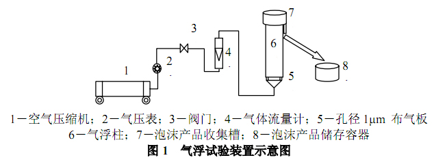 氣浮試驗(yàn)是在氣浮柱內(nèi)完成的,具體試驗(yàn)裝置見圖1。氣浮時(shí)添加沉淀劑和氣浮劑混合均勻后攪拌5 min,然后將水樣直接加入到氣浮柱6中。開動(dòng)空氣壓縮機(jī)1后,打開閥門3并調(diào)節(jié)其大小使氣壓表2保持在0.25MPa,經(jīng)氣體流量計(jì)4后由布?xì)獍?產(chǎn)生微小氣泡進(jìn)行氣浮。同時(shí)浮出物會(huì)從泡沫產(chǎn)品收集槽7中轉(zhuǎn)移到泡沫產(chǎn)品儲(chǔ)存器8中。氣浮結(jié)束后,把泡沫產(chǎn)品和氣浮柱內(nèi)的水分別過濾,濾出的固體在50oC烘干4 h后稱重。用氣浮回收率評(píng)價(jià)氣浮的效果,其數(shù)值是泡沫產(chǎn)品中的固體質(zhì)量占?xì)飧∏八畼又锌偣腆w總質(zhì)量的百分?jǐn)?shù)。 泡沫產(chǎn)品中的固體送紅外光譜測(cè)試,分析氣浮劑與沉淀物的吸附機(jī)理。