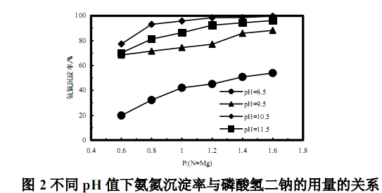 圖2是在保持鎂的用量為1不變,改變磷的添加量(表示為P:(N=Mg))在不同pH值時(shí)氨氮沉淀率的試驗(yàn)結(jié)果。