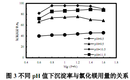 圖3是在保持磷1時(shí),改變鎂的用量(表示為Mg:(P=N))在不同pH值時(shí)氨氮沉淀率的試驗(yàn)結(jié)果。