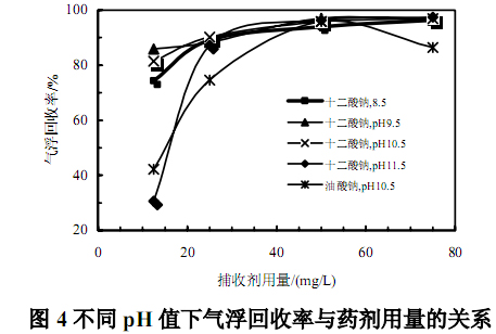 從圖中還可以看到十二酸鈉用量少時(shí),不同 pH值的氣浮效率差距比較大,而且在 pH=9.5 時(shí)的氣浮效率最高。隨著十二酸鈉用量的增加,不同 pH值的氣浮效率的差距逐漸減小,特別是 pH=8.5 和 9.5 的兩種情況,當(dāng)十二酸鈉用量為12.5mg/L 時(shí) pH=9.5 的氣浮效率比 pH=8.5 時(shí)高 11.6 個(gè)百分點(diǎn),用量增加到75mg/L 時(shí) pH=8.5 和 pH=9.5 的氣浮效率幾乎沒有差別。從這種規(guī)律中可以看到要達(dá)到較高的氣浮效率 pH=11.5 時(shí)用量比 pH=9.5 時(shí)大。pH=9.5 時(shí)加入25mg/L 十二酸鈉氣浮效率就可達(dá) 88.3%,在 pH=10.5 時(shí)添加 25mg/L 十二酸鈉氣浮效率就可達(dá)到 90.1%。從氣浮試驗(yàn)結(jié)果看,pH 值低時(shí)有利于氣浮,但 pH值低對(duì)沉淀不利。綜合考慮沉淀浮選的 pH應(yīng)為 10.5,最佳氣浮劑為十二酸鈉,用量為 75mg/L,此時(shí)氣浮的回收率為 96.9%,沉淀氣浮氨氮的總回收率可以達(dá)到92.9%。