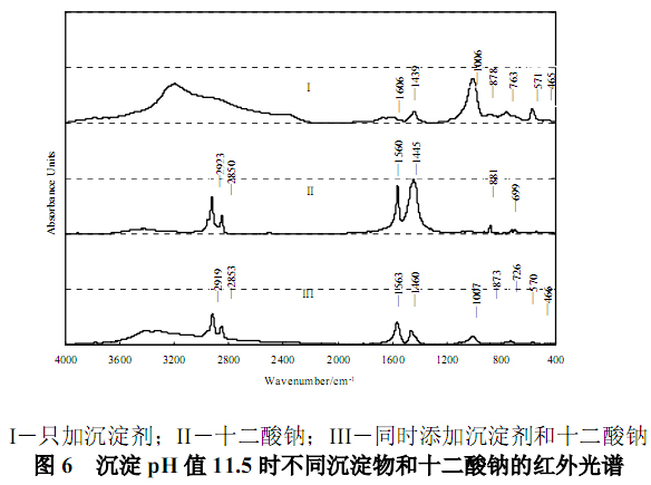 圖6中譜圖III是同時(shí)添加沉淀劑和十二酸鈉生成的沉淀物的紅外光譜圖。 從圖中看出,沉淀中有十二酸根離子的存在,最明顯的是 2919cm?1和 2853cm?1兩個(gè)吸收峰,說明十二酸鈉吸附在了沉淀物中。但十二酸鈉的特征吸收峰出現(xiàn)在1560 cm?1的R-COO-中-COO-基團(tuán)的不對(duì)稱伸縮振動(dòng)吸收峰的相對(duì)強(qiáng)度發(fā)生了明顯變化,并且十二酸鈉特征峰位置發(fā)生了變化,即其對(duì)稱振動(dòng)吸收峰的位置也由 1445 cm?1位移到 1460cm?1,從位移幅度可以判斷其周圍的化學(xué)環(huán)境發(fā)生了變化,即可以認(rèn)為十二酸鈉與沉淀物發(fā)生了化學(xué)吸附。