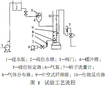 該處理系統(tǒng)的核心裝置是由生物反應器和微濾膜組件兩部分組成。其中,生物反應器主體是直徑150mm,高1200mm的有機玻璃柱;膜組件采用天津膜天膜工程技術有限公司提供的MTSH-65試驗型中空纖維膜,孔徑0.2μm,膜面積1m2。