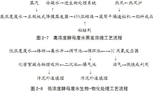 企業(yè)的廢水分成高濃度廢水(發(fā)酵液分離廢水)與低濃度廢水(主要是各種洗水),高濃度廢水采用蒸發(fā)濃縮工藝(圖2-7)處理,低濃度廢水采用生物+物化工藝(圖2-8)處理。具體流程如下: