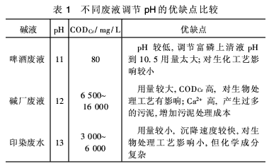分別考察了李村河污水處理廠周邊區(qū)域印染廢水、堿廠廢液、啤酒廠洗瓶廢液調(diào)節(jié)pH的效果,見(jiàn)表1。