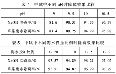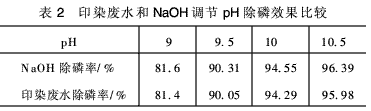 通過(guò)比較發(fā)現(xiàn)印染廢水用量較小并且沉降性能好。所以選取印染廢水進(jìn)行試驗(yàn)并與NaOH進(jìn)行對(duì)比,以確定其能否達(dá)到除磷效果的要求,結(jié)果見(jiàn)表2(反應(yīng)溫度=20℃,海水投加比例為1/5,反應(yīng)時(shí)間20 min)。