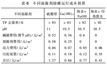 通過(guò)表6可以看出海水+印染廢水強(qiáng)化除磷費(fèi)用更低,適合在沿海城市污水處理廠應(yīng)用。