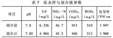 將最優(yōu)條件下的中試出水與污水處理廠進(jìn)水按照1∶18混合(該廠設(shè)計(jì)進(jìn)水9萬(wàn)m3/d,污泥上清液約3 500 m3/d,則海水使用量為700 m3/d,印染廢水投加量為800 m3/d),與原污水處理廠污泥上清液回流之后的取樣點(diǎn)水樣進(jìn)行比較,考察主要參數(shù)的變化情況和對(duì)生物處理工藝的影響(見(jiàn)表7)。