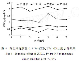 由于活性炭對(duì)有機(jī)污染物的吸附能力存在吸附飽和及隨原水中CODMn含量波動(dòng)而波動(dòng)的問題,因此在直飲水生產(chǎn)中尋求一種能較徹底地去除微量有機(jī)污染物的技術(shù)顯得尤為重要。兩組納濾膜在0.7/70%工況下,對(duì)自來水中CODMn的去除情況見圖4。