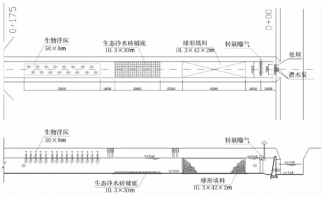 將生態(tài)凈水磚敷設(shè)于多面空心球生物接觸區(qū)下游的河底上,敷設(shè)長度30 m,敷設(shè)面積256 m2。先在河底鋪一層素混凝土塊,在混凝土初凝前將生態(tài)凈水磚放置在素混凝土上,每塊凈水磚之間留一定的間距,保持每塊凈水磚有5 個面向水中釋放微生物。約需凈水磚9.1 m3。水質(zhì)凈化工程布置見圖1。