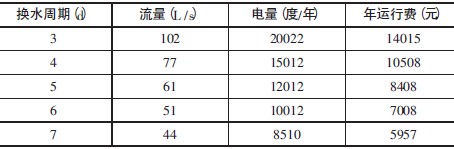 換水周期及換水量:換水周期應(yīng)綜合考慮水質(zhì)改善效果、投資和運行費用。為了保證換水周期內(nèi)水體溶解氧不小于1 mg /L,水質(zhì)不發(fā)臭,首先對換水進行適當?shù)奶幚砗统溲,使水體BOD5降低到10 mg /L 以下,溶解氧恢復(fù)到6 mg /L 以上。水體在楊莊河流動過程中還發(fā)生著底泥耗氧和水面覆氧,30℃條件下底泥耗氧速率按2400 mg /(m2·d)考慮,水面覆氧按3000 mg /(m2·d)考慮,平均水深1.8 m。則河水溶解氧平衡為: