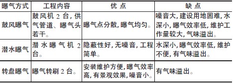 a. 曝氣方法。可供選擇的曝氣方法有:鼓風(fēng)曝氣、潛水曝氣、轉(zhuǎn)盤曝氣。鼓風(fēng)曝氣需要新建鼓風(fēng)機房,并在水底安裝曝氣管和曝氣頭;潛水曝氣在水底安裝潛水曝氣機;轉(zhuǎn)盤曝氣在水面安裝轉(zhuǎn)刷曝氣機。各種曝氣方式的優(yōu)缺點比較見表2。