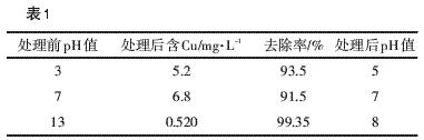 硫化鈉0.004 g,模擬廢水50 mL,加入試劑前溶液Cu2+的濃度為80 mg·L-1,振蕩1 h,用HCl和NaOH調(diào)節(jié)溶液的pH值,溶液pH值對(duì)沉淀效果的影響見(jiàn)表1。