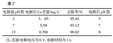 模擬廢水50 mL,電解前溶液Cu2+濃度為80 mg/L,用HCl和NaOH調(diào)節(jié)溶液的pH值,溶液pH值對(duì)實(shí)驗(yàn)的影響見(jiàn)表2。