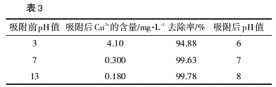 由表3可見(jiàn),溶液pH值對(duì)吸附效果有較大的影響,pH值在中性或偏堿性時(shí),有利于吸附,在偏堿性條件下吸附效果最佳,此時(shí)銅離子去除率可達(dá)到99.78%。