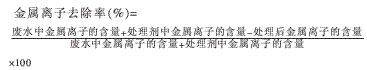 將4種處理劑分別加入25mL電鍍廢水中,靜置10min,再用1mol/L的NaOH調(diào)節(jié)pH值至7.0~7.5,慢速振蕩15min,過濾,測定濾液中Cu2+、Zn2+、Ni2+的濃度。換算出處理劑對Cu2+、Zn2+、Ni2+的去除率(%),計算公式如下: