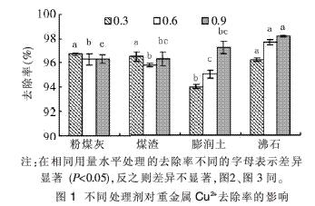 不同用量水平的煤渣對Cu2+、Zn2+、Ni2+離子去除效果的影響與粉煤灰的相近。其原因可能是由于粉煤灰與煤渣同屬于碳系物質(zhì),其成分與結(jié)構(gòu)十分類似,對重金屬的處理效果的差異也比較小。4種處理劑中,沸石對Cu2+的去除效果最好,對Zn2+和Ni2+的去除效果最差。由于處理吸附時間不同,且未對沸石進行前期改性,固本研究中沸石對Zn2+和Ni2+的去除率要低于羅道成等人的結(jié)果。膨潤土對Cu2+的去除效果最差,對Zn2+和Ni2+的去除效果最好,與沸石相反。表明不同的處理劑對不同的重金屬有選擇性的吸附。粉煤灰和膨潤土對Cu2+和Zn2+的去除效果相近,由于粉煤灰的市場價格僅為膨潤土的1/5,實際生產(chǎn)中可用粉煤灰代替膨潤土對重金屬離子進行處理,可節(jié)約80%的成本,此結(jié)果與齊廣才等人的研究結(jié)果相近。且粉煤灰為電廠燃煤排出的廢渣,以廢治廢,成本低廉,易于推廣。