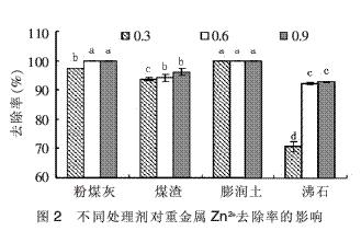 由圖2得知,隨著用量水平的增加,煤渣、膨潤土對Zn2+的去除率無顯著性差異,粉煤灰、沸石對Zn2+的去除率呈上升趨勢。粉煤灰和膨潤土3個用量水平的Zn2+去除率都顯著高于煤渣和沸石處理的。當(dāng)處理劑用量水平為0.3g時,粉煤灰、煤渣、膨潤土、沸石對廢水中Zn2+的去除率存在差異,其中膨潤土最高,達到100%,其次是粉煤灰和煤渣,沸石的最低。當(dāng)處理劑用量為0.6g時,粉煤灰和膨潤土對Zn2+的去除率均為100%,顯著高于煤渣和沸石,而煤渣對Zn2+的去除率顯著高于沸石;與處理劑用量為0.9g時結(jié)果相同。上述結(jié)果表明,粉煤灰和膨潤土對Zn2+的去除效果優(yōu)于煤渣和沸石,且粉煤灰和膨潤土的去除效果相差不大。在0.3g、0.6g、0.9g3個用量水平下經(jīng)粉煤灰和膨潤土處理的Zn2+濃度都在0~0.5mg/L之間,達到了國家排放標(biāo)準(zhǔn)1.5mg/L。而粉煤灰的市場價格僅為膨潤土的1/5,因此可用粉煤灰代替膨潤土來處理Zn2+,能降低80%的成本。另外,煤渣對Zn2+的去除效果顯著優(yōu)于沸石,且煤渣的3個用量水平的去除效果均達到了國家排放標(biāo)準(zhǔn)?傮w而言,膨潤土對電鍍廢水Zn2+的去除效果最好,粉煤灰的去除效果次之,沸石的去除效果最差。