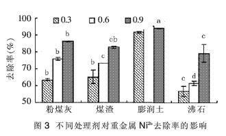 本研究結(jié)果表明,在相同的用量水平下,粉煤灰、煤渣、沸石對Cu2+、Zn2+、Ni2+的去除效果均存在差異,具體表現(xiàn)為:粉煤灰對Zn2+的去除效果最好,Cu2+的次之,Ni2+的最差;煤渣對Cu2+和Zn2+的去除效果相近,且都優(yōu)于對Ni2+的去除效果;沸石Cu2+的去除效果最好,Zn2+的次之,Ni2+的最差。膨潤土對3種重金屬離子的去除效果無顯著差異,且相對其他處理劑較好,去除率均達91.5%以上;4種處理劑中,沸石對Cu2+的處理效果最好,膨潤土對Zn2+和Ni2+的處理能力最好,粉煤灰和煤渣的處理能力為兩者之間。