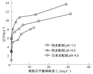 (1) 吸附等溫線試驗。使用地下水配制(本文除標(biāo)明純水配制以外,其余溶液配制均使用大興地下水) 砷溶液濃度為1~20 mg/ L ,取所配溶液100 mL 置于8個250 mL 錐形瓶中,分別投加吸附劑0. 1 g ,在25 ℃和150 r/ min 條件下避光振蕩,平衡24 h 后進行砷濃度測定。