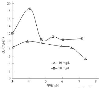 (2) p H 試驗。2個平行體系(每個體系8 個250 mL 錐形瓶) 原溶液砷濃度分別為10 mg/ L 和20 mg/ L ,各加入0. 1 g 吸附劑,在25 ℃和150 r/ min 條件下避光振蕩,使用稀HCl 和稀NaOH 調(diào)節(jié)p H 分別為3. 0、4. 0、5. 0、6. 0、7. 0、8. 0、9. 0、10. 0 ,在25 ℃,150 r/ min 條件下避光振蕩,24 h 后(其中中間調(diào)節(jié)p H 至初始p H 值3 次) 進行砷濃度測定,并測定平衡p H 值。