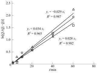 吸附劑的吸附動力學(xué)性能對于吸附劑的實際應(yīng)用具有十分重要的影響。用一級動力學(xué)模型方程對吸附動力學(xué)試驗數(shù)據(jù)進行回歸分析,結(jié)果如圖3 所示。因變量y 代表ln[ Qe / ( Qe- Qt ) ] (Qe 為FeO (OH) 吸附劑的飽和吸附量,mg/ g ; Qt 為FeO(OH) 吸附劑t 時刻的瞬時吸附量,mg/ g) ,自變量x 代表時間t 。由圖3 可見,相關(guān)系數(shù)R2 均大于0. 96 ,表明FeO(OH)吸附劑的吸附動力學(xué)符合一級動力學(xué)模型。