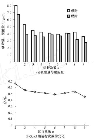 為了考察FeO (OH) 吸附劑的可重復(fù)利用性, 進行了FeO(OH) 吸附劑經(jīng)過連續(xù)9 次的再生回用試驗,結(jié)果見圖4(a) 。從圖4 (a) 中可以看出,首次運行FeO(OH) 吸附劑吸附容量達到最大,之后吸附容量降低,并逐漸趨于穩(wěn)定,每次運行脫附率(脫附量/ 吸附量×100%)都為75 %~98. 6 %。