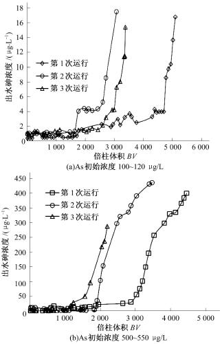 增大As (Ⅴ) 濃度至500~550μg/ L ,見圖5 (b) ,第1 次穿透曲線在10μg/ L 的穿透濃度時,BV 為1 400 ,第2 次雖然穿透倍柱體積(1 900) 大于第1 次,但隨后出水砷濃度迅速遠(yuǎn)大于同倍柱體積下第1 次吸附,而第3 次穿透倍柱體積為1 100 ,其對應(yīng)的脫附率見表2 。由表2 可見,隨著運行次數(shù)的增加,脫附率穩(wěn)定在80 %左右。